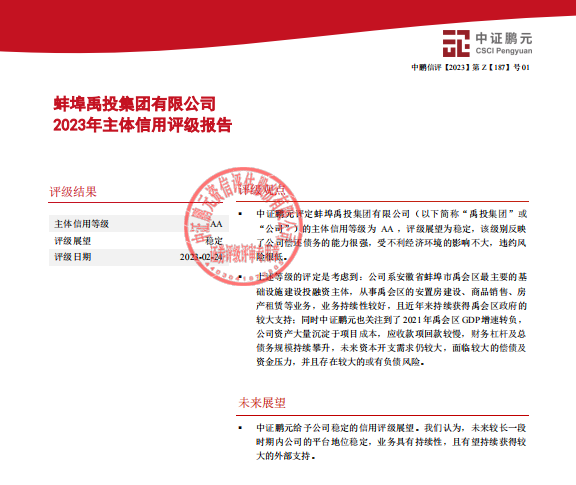 2023年2月24日,蚌埠禹投集團(tuán)有限公司順利榮獲中證鵬元資信評估股份有限公司評定的“AA”主體信用評級,評級展望為穩(wěn)定,成為蚌埠市禹會區(qū)繼蚌埠禹會建設(shè)投資有限責(zé)任公司后第二家“AA”信用評級的國有企業(yè)。