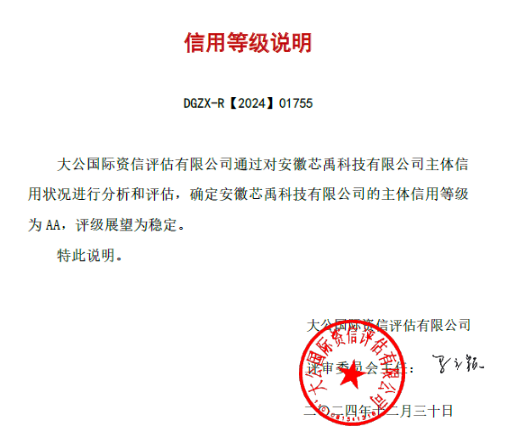 2024年12月30日,安徽芯禹科技有限公司(以下簡稱“安徽芯禹公司”)獲取“大公國際資信評估有限公司”主體信用AA評定,評級展望為穩(wěn)定。