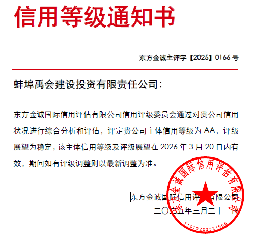 2025年3月21日,蚌埠禹會建設投資有限責任公司(以下簡稱“蚌埠禹會建投公司”)再次獲取“東方金誠國際信用評估有限公司”主體信用AA評定,評級展望為穩(wěn)定。